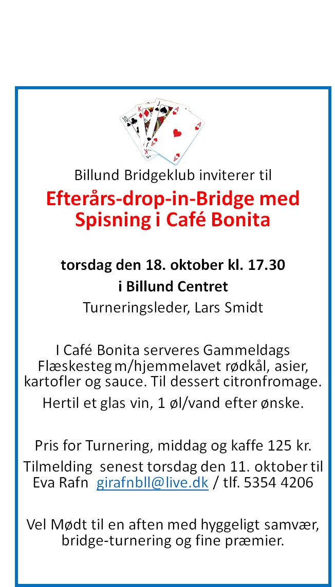 Tilmelding: Senest den 7. oktober kl. 16.00 til mail: stinverkristensen@gmail.com Angiv: Navn og klub, makker og klub